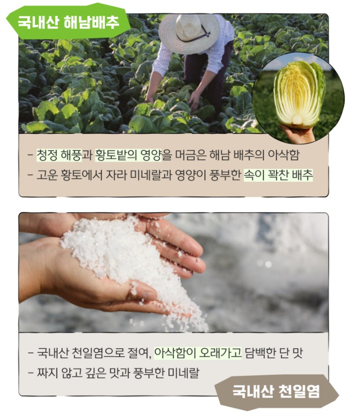 - 김치 맛이 달라지는 이유가 있나요? 해남 배추는 당도가 높아 양념과 조화를 이룹니다.